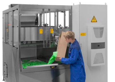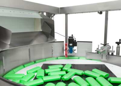 Die Ausblasstation mit ionisierter Luft entfernt zuverlässig Staubpartikel und Produktionsrückstände von den Flaschen – ein klarer Pluspunkt für Anwender, die besonderen Wert auf Produktreinheit und Verpackungsqualität legen.